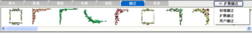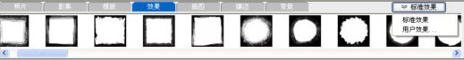 D.增加效果及镶边: 点击编辑菜单中的“效果”或“镶边”,选中效果或镶边图片,按住左键拖入相册版面区中的照片上,可使效果或镶边增加到照片上。点击“效果”或“镶边”时,右侧的按钮会自动切换成“标准效果”或“标准镶边”等,点击该按钮可弹出下拉菜单,允许用户选择不同风格的效果或镶边。