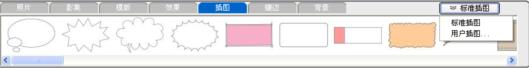 E. 增加插图: 点击编辑菜单中的“插图”,选中插图图片,按住左键拖入相册版面区的有效区中,可使插图插入到版面中。所有插图可以象照片一样进行拖动及旋转。右侧的按钮会自动切换成“标准插图”等,点击该按钮可弹出下拉菜单,允许用户选择不同风格的插图。