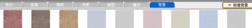F. 增加版面背景: 点击编辑菜单中的“背景”,选中效果或镶边图片,按住左键拖入相册版面区中,可使背景图案显示在版面上。右侧的按钮会自动切换成“标准背景”等,点击该按钮可弹出下拉菜单,允许用户选择不同风格的背景。