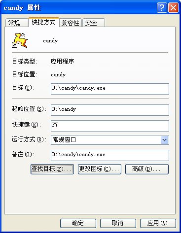 快捷方式的快捷键。你可以将Candy的快捷方式发送到桌面,或者是开始菜单中,然后对它设置一个快捷键(不少Candy粉丝都的F7,不过TC用户应该不会用这个的),按下这个快捷键,即可启动Candy,如下图: