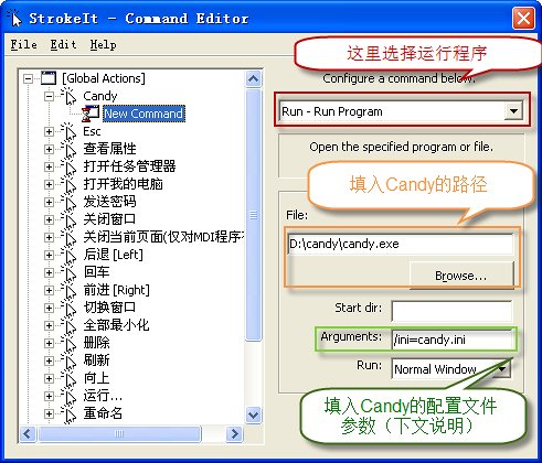 关于启动方面,还有一点需要提醒的,或许你已经通过上面StrokeIt和TC的图注意到了,那就是在启动Candy时,需要带一个启动参数:/ini=*****。这是在为Candy运行时指定一个配置文件,当你有多个配置文件的时候比较有用。当然,如果你只需要一个配置文件,那么你也可以不加参数,但是你的配置文件必需命名为 candy.ini。另外,添加 /ini 参数时,注意:路径和 /ini 参数之前一定要有一个空格。