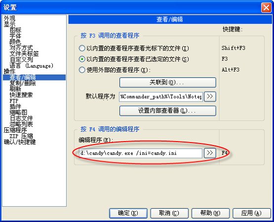对未被定义文件类型的操作。注:如果在后面设置了独立的文件格式,比如txt,那么对txt文件调用Candy时,将不再使用AnyFile的配置。即:AnyFile的设置只针对配置文件里没有设置独立插件的后缀名。 AnyFile="c:\Program Files\Notepad++\notepad++.exe" |