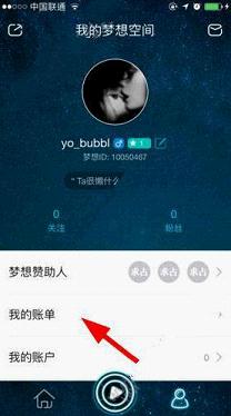 打开梦想直播app进入到个人中心,在“我的梦想空间”您可以直接点击“我的账单”按钮;