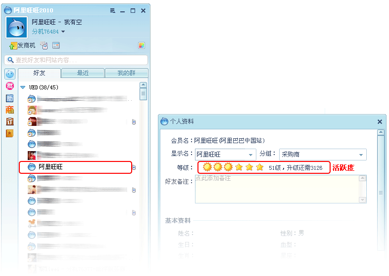 在阿里旺旺联系人列表中,点击联系人姓名前的旺旺图标查看对方的活跃度。