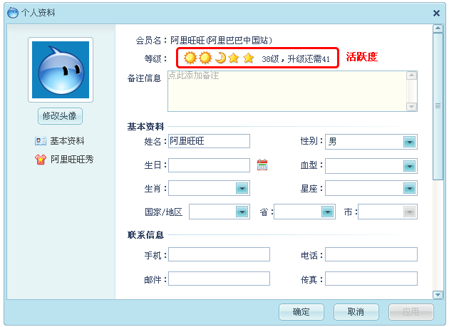 在阿里旺旺窗口中,单击左上角“旺旺图标”或者“活跃度”文字链接,您就可以查看自己的活跃度信息。