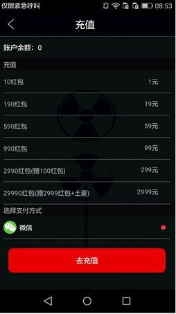 4、跳转至充值页面后你可以选择自己充值的数额,6元代表60红包、15元代表150红包、50元代表500红包(赠送50红包)等等,选择支付方式之后点击“去充值”就可以充值成功了!