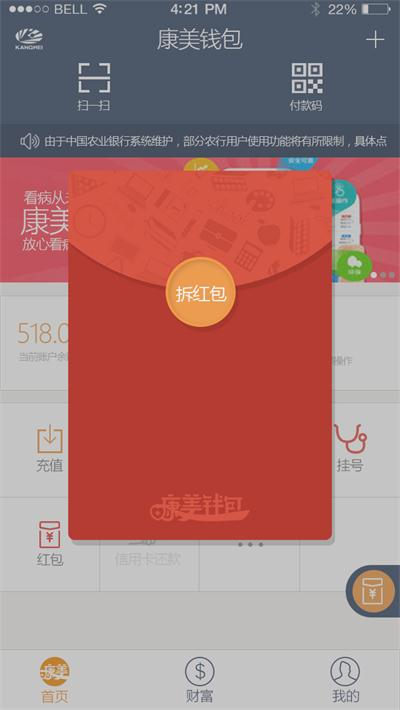 首先打开康美钱包app,没有实名认证的用户直接就会出现提示哦,点击实名认证。