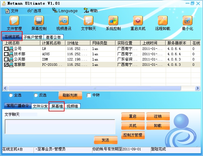 复选多台计算机,点击“屏幕墙”,可同时查看多台计算机屏幕!