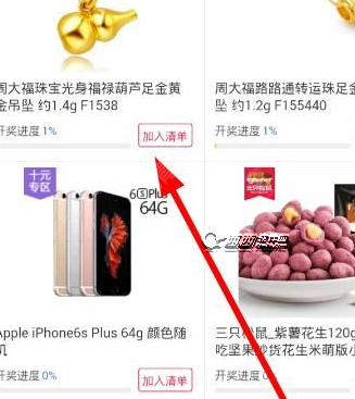 1、打开一元米淘,选择一个自己喜欢的商品,小编这里选择了“周大福黄金吊坠”为例点击“加入清单”按钮;