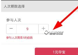 3、接下来们可以自由选择购买的个数,一个代表一元钱,购买的越多中奖率就相对越高,用户可以根据自身实力选择购买,全部选择完毕后点击“1元夺宝”就夺宝成功了哦!