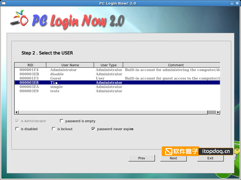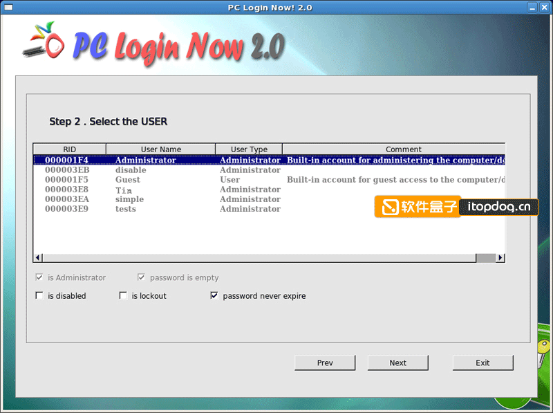 PC Login Now 2.0会列出当前系统所有已启用的帐户,包括帐户的RID、名称、权限等重要参数: