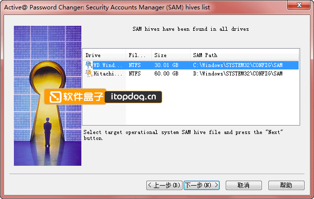 2.Active Password Changer 自动搜索到了SAM所以分区及路径: