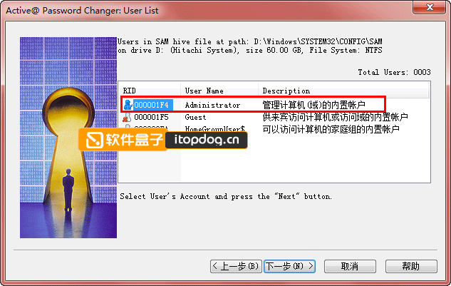 3.Active Password Changer 会自动显示Windows所有帐户,系统管理员(Administrator)会默认显示在最上方并以青色标出:
