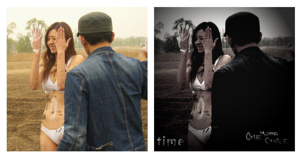 3、新建一个图层,填充黑色,图层混合模式为正片叠底,不透明度为60%,选择椭圆选框工具选区中间部分,按Ctrl + Alt + D羽化,数值为70,然后按两下Delete键删除,再打上文字,完成最终效果。
