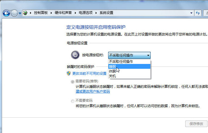 4、在“按电源按钮是”,选择“不采取任何操作”,OK,搞定,再按键盘上的POWER 键,不会在出现关机的杯具了。