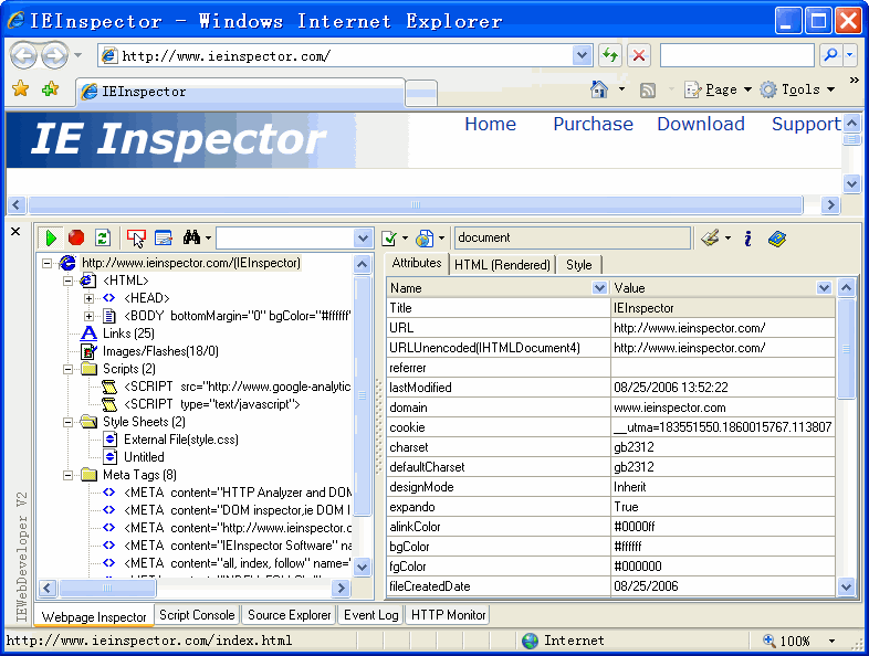 点开后就能使用IE WebDeveloper了。IE WebDeveloper有五个主窗口,首先是Webpage Inspector。Webpage Inspector左边是DOM查看器,选择一个DOM节点会在右侧对应地显示其属性值、HTML代码和CSS样式列表。在Webpage Inspector中可以动态地修改DOM结点,IE窗口会实时渲染展示出修改后的结果。(Firebug也有此功能)