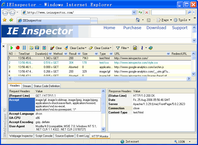 最后一个为HTTP Monitor,它可以查看和网络服务器相交互的HTTP信息,相当于Firebug的网络(net)功能,对于AJAX开发很有帮助。