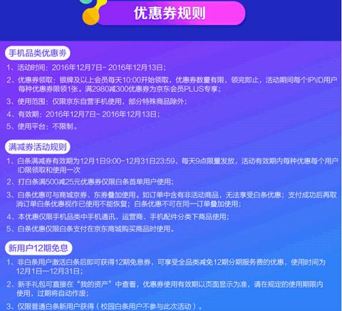 在活动期间,十余家品牌的数百款热门手机产品均参与其中。优惠方式包括12期免息、满3000减100元白条券、满1980元送100元品类券、满500元送25元白条劵等,消费者在购机时可以选择多种优惠方式。在2016年12月7日到2016年12月13日旗舰,银牌及以上会员每天10:00开始领取,优惠券数量有限,领完位置,活动期间每个IP/ID用户每种优惠券限领1张。满2980减300优惠券为京东会有PLUS专享。