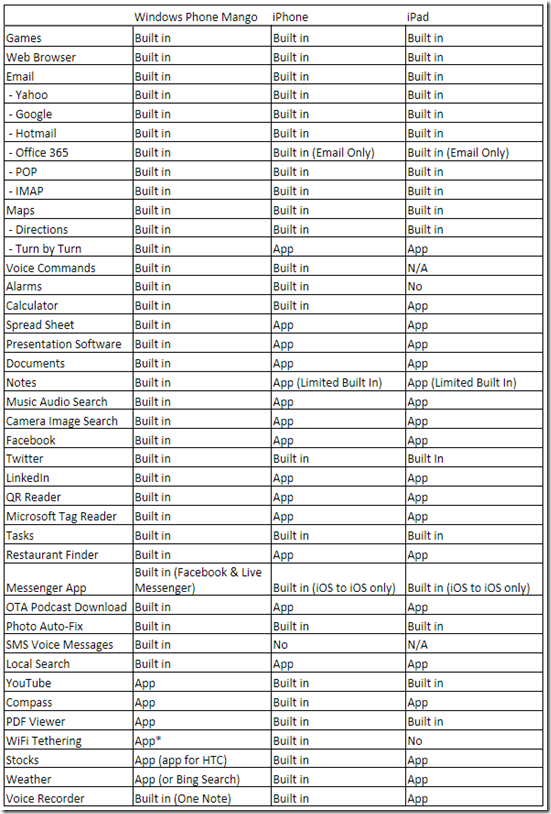 表中功能从上到下依次是:游戏;网页浏览器;邮件-雅虎,谷歌,HOTMAIL,Office 365(这是微软下一代云计算产品,包括Office、SharePoint Online),pop协议,imap(交互式邮件存取协议),地图,导航,turn by turn,语音命令,闹铃,计算器,数据表,演示软件,文档,注释,音乐搜索,图像搜索,面谱,推特,LINKEDIN,快速条码扫描器,微软标签阅读器,任务,餐馆寻找,短信程序,OTA广播下载,照片自动修复,语音短信,位置搜索,YOUTUBE,指南针,PDF阅读,WIFI tethering,炒股,天气,录音机。