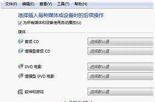 3.我们可以看到,这里的很多功能都是选择的默认值,而咱们的win7电脑的默认值也就是自动开启的。选项也是比较多的,大家可以根据自己的不同需要然后对这一项进行设置,或者使用media player来进行播放,或者使用iTunes来进行播放,或者不执行任何操作,或者每次都询问。这些都是可以设置的,而下一次在遇到这种情况,系统就会按照咱们的操作来进行提示。
