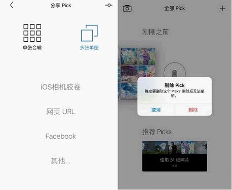 把每一个自动生成的文件夹称作 Picky,这是它的基本单位,不管你的 Picky 是一张图还是好几张图组成,针对单位的操作都是一样的。左滑删除当前的 Picky,右滑是则是分享选项。