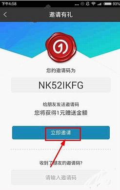 2、接着在【邀请有礼】 页面,就可看到自己的邀请码:NK521KFG,邀请好友成功后,就可获得1元现金哦。