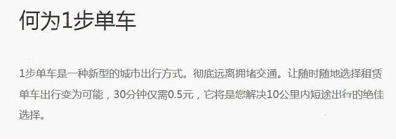 1步单车是一种新型的城市出行方式。彻底远离拥堵交通。让随时随地选择租赁单车出行变为可能,30分钟仅需0.5元,即价格是30分钟/0.5元,它将是您解决10公里内短途出行的绝佳选择。