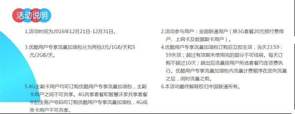 12月21日-31日期间,中国联通推出优酷专享通用流量加油日包,分为3元1GB和5元2GB两档,订购后立即生效,每天订购不超过10个,当天23:59:59失效。
