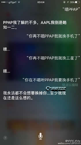 长按iPhone的Home键,启动Siri,对Siri用日语说“Pen-Pineapple-Apple-Pen”(笔-菠萝-苹果笔),Siri则模仿PPAP的节奏,加入苹果公司的产品,给出了如下爆笑反应: