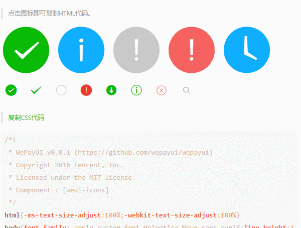 在WePayUI中,点击页面图标即可复制所需的代码,使用到你的项目中。