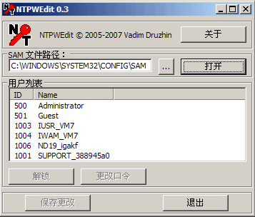 先点“打开”,选中需要修改密码的账户,然后“更改口令”,“保存更改”,完成。(如果账户为禁用状态,“解锁”一下即可。)