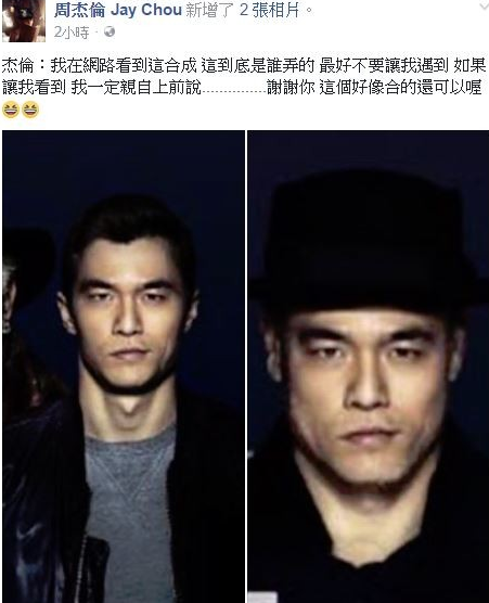 照片中,周杰伦的五官被完整放在伍迪-哈里森的脸上,脸型虽然明显宽了许多,但是完全看不出合成过的破绽,让周杰伦本人在脸书写下:“我在网络看到这合成,这到底是谁弄的,最好不要让我遇到,如果让我看到,我一定亲自上前说,谢谢你,这个好像合的还可以喔!”