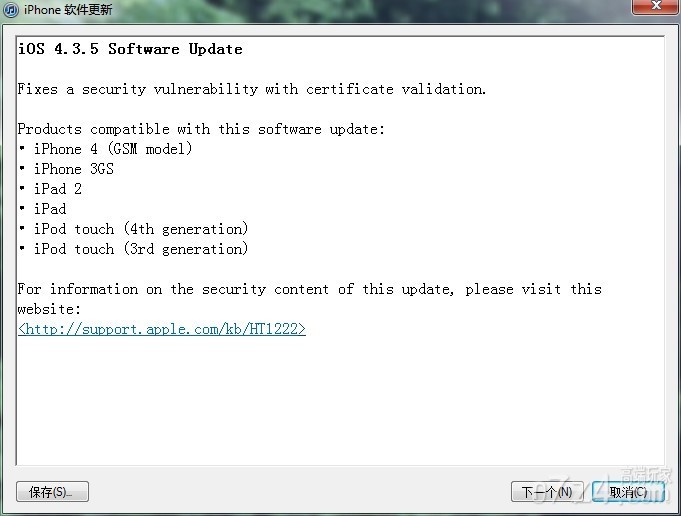 Apple公司发布iOS全系列更新:4.3.5。目前Apple尚未有关于此更新的详细说明文档。距离上次4.3.4更新仅有不到2周时间。相信此次新固件是只修复了部分漏洞的小更新。建议有锁版用户谨慎更新。
