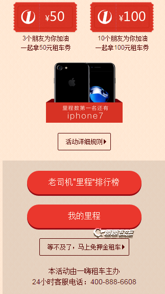 活动期间,邀请朋友为我“加里程”(成功邀请1个好友,里程数加5),里程数排名前200名的用户即可获得7天免费用车的权益,排名第一的用户还可获得iPhone7 Plus奖励。开奖时间:2017年1月12日00:00。