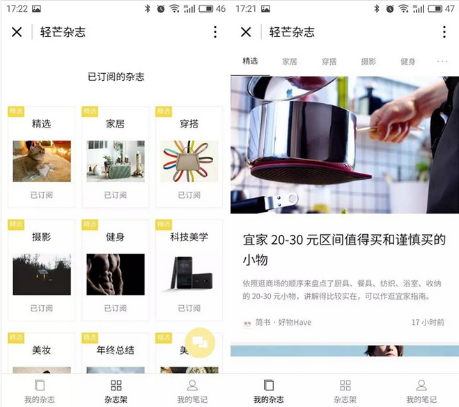 前豌豆荚创始人王俊煜创立的轻芒杂志成为了首批问世的小程序之一。“轻芒”app去年9月刚刚更新到1.0.1版本,小程序的开发也几乎在同时。可以说,这是一款源生小程序,各种操作都最适合于微信。