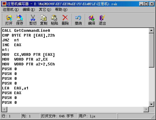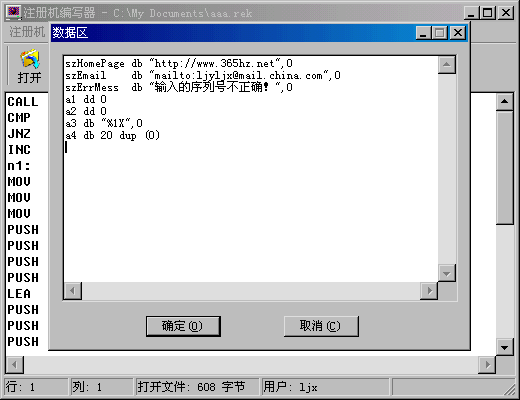 对于以上的指令并不需要过多的了解它在干什么,只要将其中的每个地址改成一个变量地址的声明,然后再原封不动的抄到注册机编写器的代码窗口中即可。