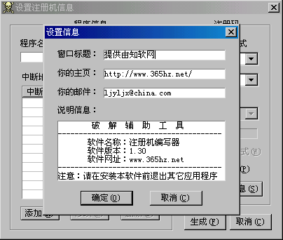 对于以上界面的说明:程序名称和中断地址的设置,这个我想用不着多说,会破解的人都懂。 而获取注册码的方式上需要说明一下,我是这样考虑的:寄存器方式-因为注册码可能是会放在寄存器中比较,并且可能经过十进制或十六进制的转换, 所以就提供了一个寄存器方式及十进制或十六进制的选项。 内存方式-是指:如设置为EDX,即指注册码保存在EDX所指向的内存地址中(而不是寄存器里)这样就为获取注册码提供了更多的选择。