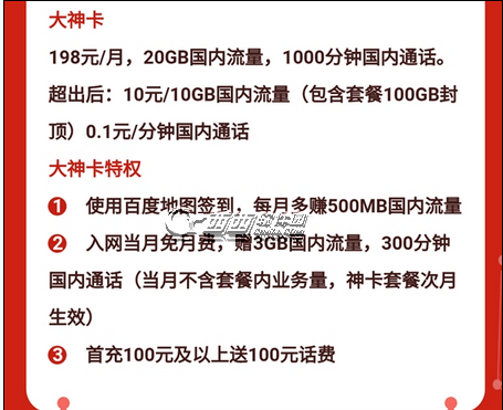 百度大神卡月租198元,其中包含20GB全国流量以及1000分钟全国通话时间,超出通话时间为0.1元/分钟(无漫游长途),超出后国内流量价格为10元/1GB。激活当月送3GB国内流量+300分钟国内通话时长。
