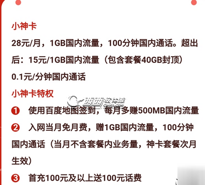 百度小神卡月租28元,其中包含1GB全国流量以及100分钟全国通话时间,超出通话时间为0.1元/分钟,超出后国内流量价格为15元/1GB。激活送1GB国内流量+100分钟国内通话时长。