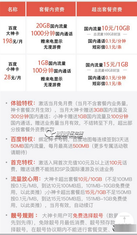 百度神卡与中国联通合作(号段176),分为大神卡和小神卡,具体资费套餐信息如下: