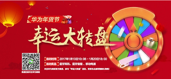 关注华为商城官方微信,赢蓝牙耳机、蓝牙音箱、移动电源大奖,活动时间:2017年1月13日10:08–1月20日18:00