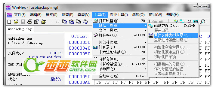 2、打开WinHex,然后打开刚才备份出来的img文件,选择工具-磁盘工具-通过文件类型恢复。