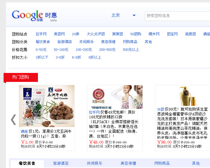 9月13日上午消息,谷歌推出针对中国用户的团购搜索服务——时惠(http://www.google.cn/shihui),正式进军电子商务市场。拉手、美团、窝窝团等一线知名团购网站均在列,这也是谷歌在中国市场沉寂两年后向用户推出的重要服务。