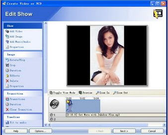 点击“建立→建立视频或VCD”命令,准备制作视频电子相册(第一次始用时,系统会自动下载并安装插件)。在向导面板中选择“Create Video”,按需求点击下一步直到“Edit Show”,选择向导面板左边的“Add Music/Audio”命令选择一个音乐文件作为背景音乐,此时视频编缉栏界面自动切换到“Toggle View Mode”模式,其中导入的音乐文件被添加到音频轨道上。