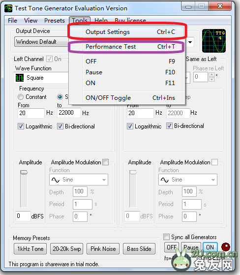关于Test Tone Generator很多网友都只能上到11025Hz, 要上更高的频率,要在Test Tone Generator的Tools那里,进入Compatibility Settings中,把Sampling Frequency(Hz)调到44100,那里不要调得太高,否则会有沙沙声,最好调到44100