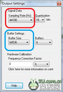然后根据图片,选择44100HZ,下面蓝色框的缓冲选择最大即可