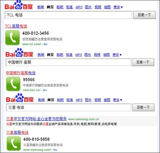 据了解,用户在百度搜索“海尔 维修”、“AO史密斯 售后”、“长虹 客服”等多个关键词时,搜索结果的显著位置呈现官方客服电话,并提醒用户注意防范虚假客服电话。截止目前,国美(微博)、奥迪、中国银行、三星、中国人寿等数千家知名企业已加入其中,通过优质内容正向引导的方式,避免大量用户因误入山寨网站而上当受骗。