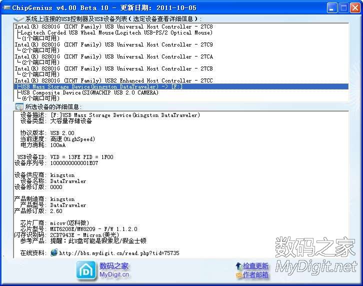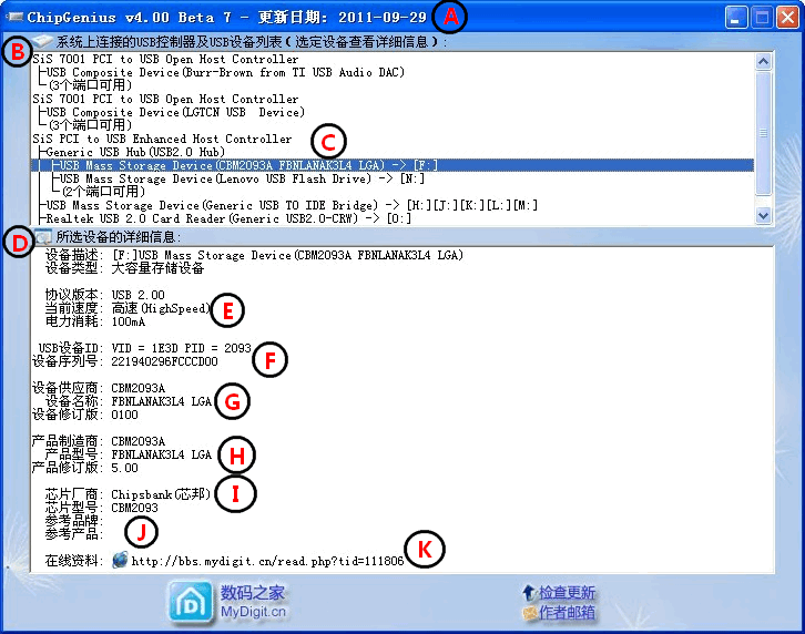 C:选择需要检测的USB设备(如U盘/MP3/MP4/摄像头/鼠标/HUB...),对新手来说这里有点复杂,不过没关系,芯片精灵会自动定位到最新插入的U盘设备,你是不是松了一口气 ^_^