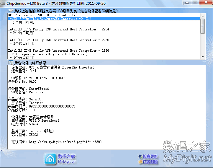 再来一张银灿主控的检测截图,看到了木有!USB3.0 SuperSpeed,多少人梦寐以求的速度!
