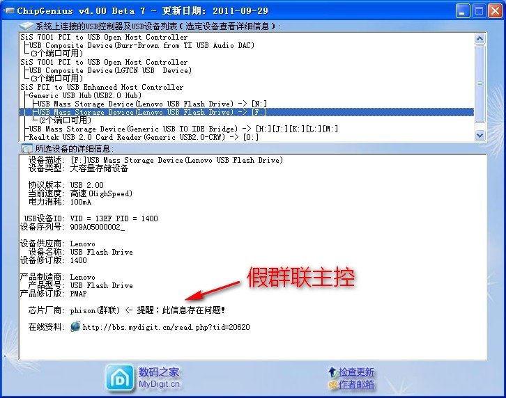 ChipGenius在业内有一定的知名度,口碑远销港澳台和海外;这也引起了一小撮别有用心、爱折腾人士的注意,他们专门用一些山寨黑盘量产为正品U盘的信息骗过ChipGeius那颗善良的芯。所以从V4.00版开始,我们加入了识别正宗群联主控的功能,对于假冒的群联主控U盘,芯片精灵会有一个提醒(如下图)!